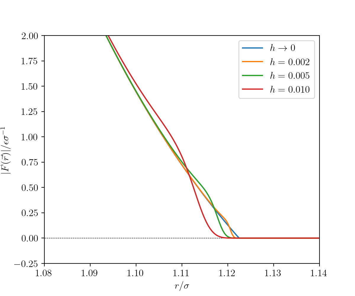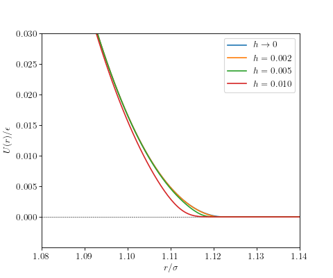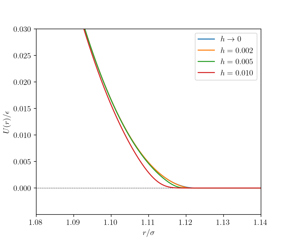 where \(r_c\) is the cutoff distance, and the parameter \(h \ll \sigma\), which has the dimension of a length, controls the the range of smoothing. The C²-continuous truncated potential then reads
